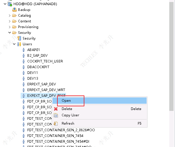 新建连接数据库的用户,要连接租户就在租户库的system用户上进行新建用户  设置好名称 密码  数据表授权一般都是在租户库的 SAPHANADB用户上授权 1\.登录上要进行操作的数据库  2\.选择要授权的用户  3\.打开要授权的用户  4\.搜索要授权的表进行授权   搜索表MSSA 给select权限即可  给SELECT权限 完成后需要保存