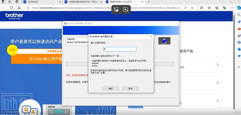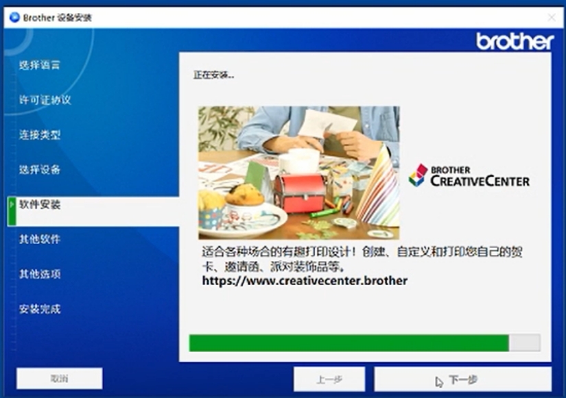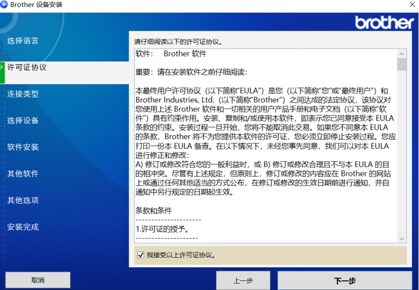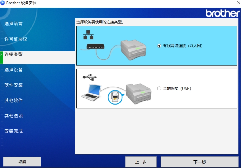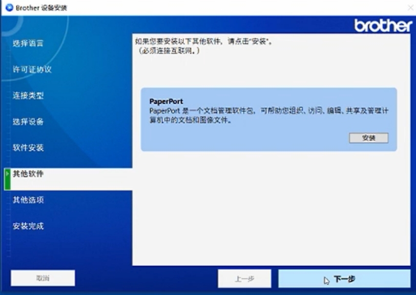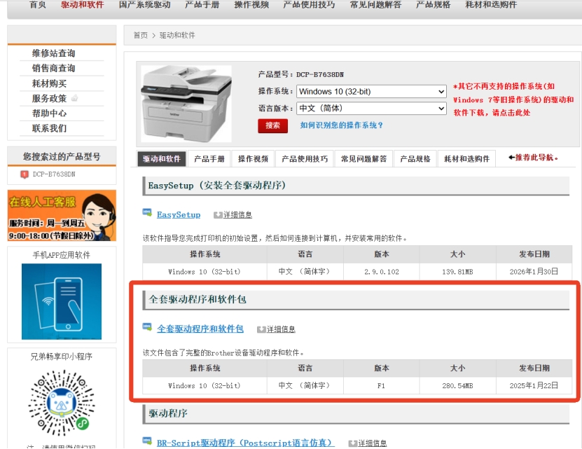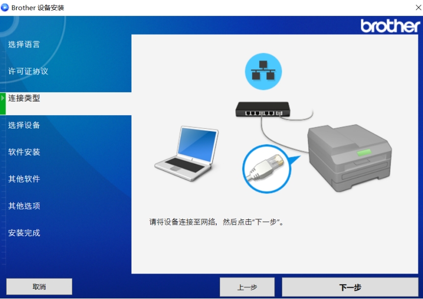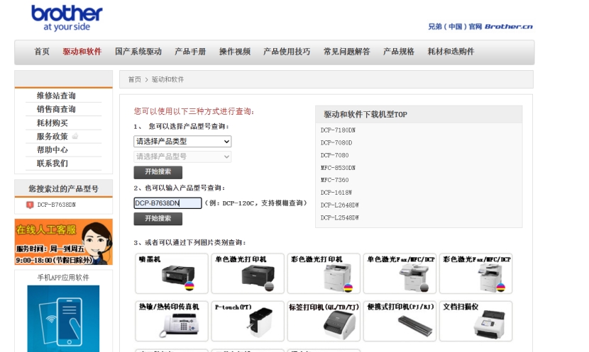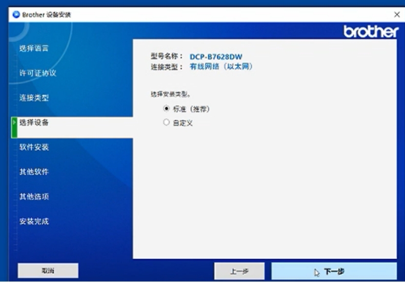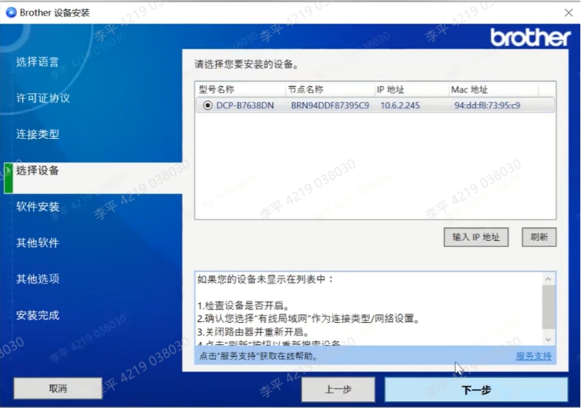 # 驱动安装教程 1\.访问兄弟打印机驱动官网[https://www.95105369\.com/Web/Download.aspx](https://www.95105369.com/Web/Download.aspx) 搜索型号:**7638DN**  2\.下载全套驱动程序和软件包  1. 安装包下好后,点击运行进入安装界面  4\.点击下一步,许可证协议勾选同意,点击下一步。  5\.连接类型,选择有线网络连接,点击下一步。  1. 点击下一步  1. 等待自动搜索打印机,如果没搜索出来手动输入IP地址:10\.6\.2\.245  8\.点击标准,然后下一步。  1. 等待安装好后,点击下一步.  1. 其他软件这里不需要安装,直接点击下一步。  1. 点击下一步,最后点击完成  1. 安装完成后,会弹出固件更新、浏览器官网都点击取消或叉掉。  1. 遇到固件更新工具,弹出需要密码时。直接取消叉掉  1. 最后检查,在设置里找到打印机设置,查看有没有出现该打印机的信息。  # 双面打印  注意:不同的软件,界面会有差异,但是都需要勾选双面打印,然后才能实现双面打印机的效果