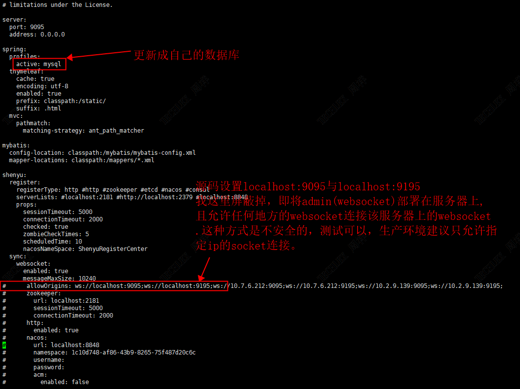部署分admin与gateway两部分。 admin:提供管理端操作平台,如增删改查认证、插件等。 gateway:提供网关服务功能,如认证服务、转发服务等。 ## 1 admin部署 参考官方部署方法:https://shenyu.apache.org/zh/docs/deployment/deployment-package 由于官方部署文档描述清晰,这里就不过多重复描述。 调试websocket的话,需要放开连接限制,如下图  查看下启动日志,查看到服务启动成功即可。 ## 2 gateway部署 官方推荐:https://shenyu.apache.org/zh/docs/deployment/deployment-custom 按照官网推荐搭建了一个springboot工程,然后引入相关的jar包,yml配置文件可以参考源码配置,我是将该boot工程注册到nacos上,websocket设置成服务器上的配置,如下  如下着重介绍下gateway启动流程。工程启动流程如下  即该工程启动主要干了两件事,1:加载(可用的)插件,为什么说可用的呢?因为官方的插件有40多种,我们自建工程不需要那么多,因此搭建该工程的时候也不需要引入那么多插件的jar包。2:数据同步,这是什么意思呢?注意本工程的yml文件中是没有连接数据库的配置,但是有websocket的配置,即本工程所需要的数据都是从admin端的websocket push过来的,存入本地的缓存中。 ### 2.1 加载插件 工程启动后,优先去加载(可用的)插件,对应的jar包: ``` <dependency> <groupId>org.apache.shenyu</groupId> <artifactId>shenyu-spring-boot-starter-gateway</artifactId> <version>${shenyu.version}</version> </dependency> ``` 工程源码如下:  ### 2.2 同步数据 该工程采用官方默认的方式:websocket,对应的jar包: ``` <dependency> <groupId>org.apache.shenyu</groupId> <artifactId>shenyu-spring-boot-starter-sync-data-websocket</artifactId> <version>${shenyu.version}</version> </dependency> ``` 工程源码如下:  websocket连接成功如下,为什么这里需要列出来?阅读这部分源码可用了解原作者websocket的集成思想,同时为了解决admin端websocket放开连接控制处代码不安全的问题。截图如下:  该部分代码主要在ShenyuWebsocketClient.java文件,websocket连接成功后,开始同步数据,即执行方法: ``` public void onMessage(String result) { this.handleResult(result); } ``` handleResul()方法如下: ``` private void handleResult(String result) { LOG.info("handleResult({})", result); WebsocketData<?> websocketData = (WebsocketData)GsonUtils.getInstance().fromJson(result, WebsocketData.class); ConfigGroupEnum groupEnum = ConfigGroupEnum.acquireByName(websocketData.getGroupType()); String eventType = websocketData.getEventType(); String json = GsonUtils.getInstance().toJson(websocketData.getData()); this.websocketDataHandler.executor(groupEnum, json, eventType); } ``` WebsocketDataHandler.java文件如下: ``` public class WebsocketDataHandler { private static final EnumMap<ConfigGroupEnum, DataHandler> ENUM_MAP = new EnumMap(ConfigGroupEnum.class); public WebsocketDataHandler(PluginDataSubscriber pluginDataSubscriber, List<MetaDataSubscriber> metaDataSubscribers, List<AuthDataSubscriber> authDataSubscribers) { ENUM_MAP.put(ConfigGroupEnum.PLUGIN, new PluginDataHandler(pluginDataSubscriber)); ENUM_MAP.put(ConfigGroupEnum.SELECTOR, new SelectorDataHandler(pluginDataSubscriber)); ENUM_MAP.put(ConfigGroupEnum.RULE, new RuleDataHandler(pluginDataSubscriber)); ENUM_MAP.put(ConfigGroupEnum.APP_AUTH, new AuthDataHandler(authDataSubscribers)); ENUM_MAP.put(ConfigGroupEnum.META_DATA, new MetaDataHandler(metaDataSubscribers)); } public void executor(ConfigGroupEnum type, String json, String eventType) { ((DataHandler)ENUM_MAP.get(type)).handle(json, eventType); } } ``` 由此处代码可知:onMessage方法主要是从admin的websocket中同步数据,然后将同步的数据分类保存到这个map中EnumMap<ConfigGroupEnum, DataHandler> ENUM_MAP,查看ENUM_MAP的源码可知,同步的数据类型有 ``` public enum ConfigGroupEnum { APP_AUTH, PLUGIN, RULE, SELECTOR, META_DATA; ``` 即认证、插件、规则、选择器、元数据,这些数据也涵盖了gateway工程所有业务数据,不包含用户、权限数据。 自此gateway服务启动起来,一旦有请求进来,则从ENUM_MAP中取出数据进行处理。