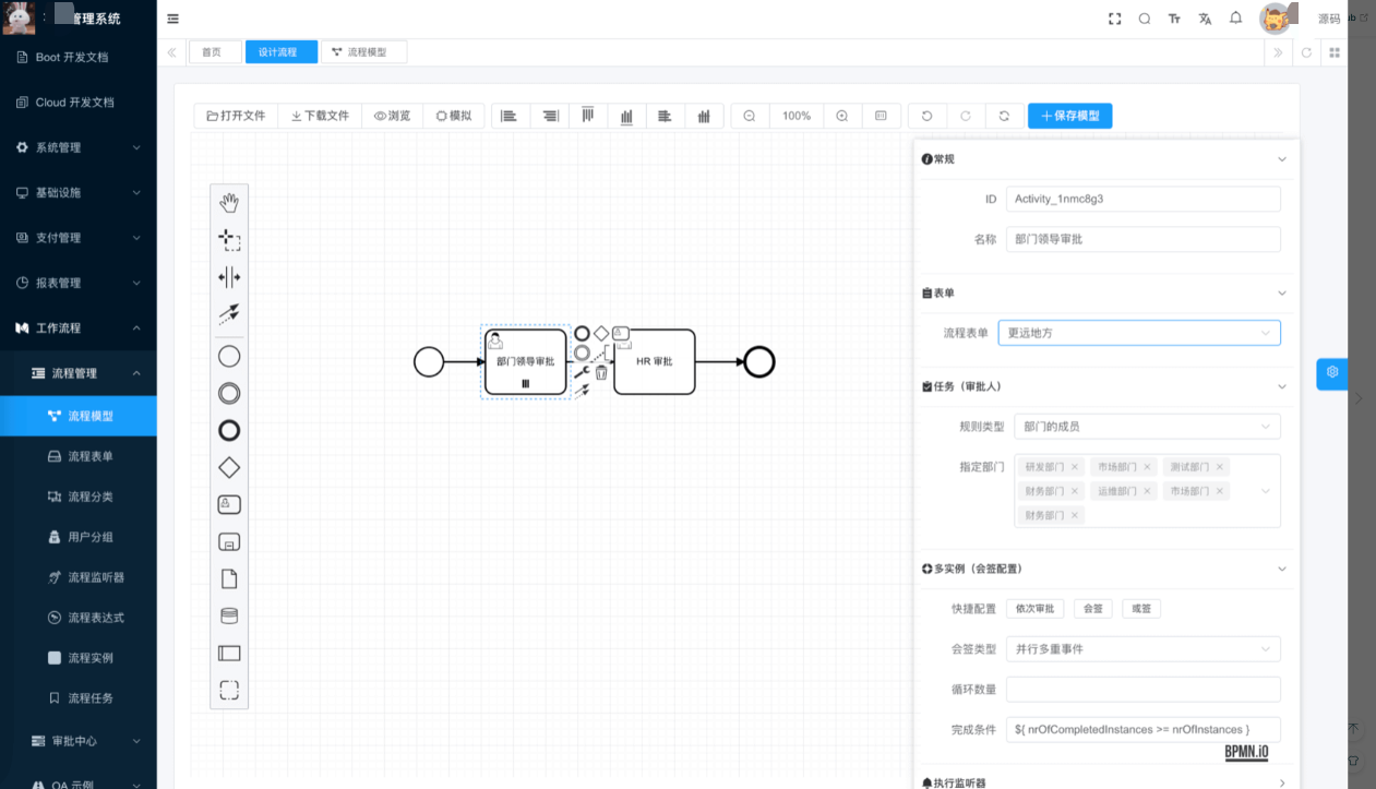 > 友情提示:BPM 全称是,业务流程管理(Business Process Management),实现工作流的功能 ## 1. 演示地址 1.1 BPM 管理后台 演示地址:http://dashboard-vue3.yudao.iocoder.cn/(opens new window) 菜单:“工作流程”下的「流程管理」「审批菜单」「OA 实例」等 仓库:https://github.com/yudaocode/yudao-ui-admin-vue3 (opens new window)的 bpm 目录,基于 Vue3 + Element Plus 实现  ### 1.2 BPM 后端 支持 Spring Boot 单体、Spring Cloud 微服务架构 单体仓库: https://github.com/YunaiV/yudao-cloud (opens new window)的 yudao-module-bpm 模块 微服务仓库: https://github.com/YunaiV/yudao-cloud (opens new window)的 yudao-module-bpm 服务 ## 2. 工作流启动 参见 《工作流手册 —— 功能开启》 文档,一般 3 分钟就可以启动完成。 ## 3. 功能描述  基于 Flowable 构建,满足中国特色流程操作:  ### 3.1 BPMN 流程设计器  - 《流程设计器(BPMN)》 - 《选择审批人、发起人自选》 - 《会签、或签、依次审批》 - 《执行监听器、任务监听器》 - 《流程表达式》 ### 3.2 钉钉(飞书)流程设计器  《流程设计器(钉钉、飞书)》 ### 3.3 审批界面  - 《审批接入(流程表单)》 - 《审批接入(业务表单)》 - 《流程发起、取消、重新发起》 - 《审批通过、不通过、驳回》 - 《审批加签、减签》 - 《审批转办、委派、抄送》 - 《流程审批通知》