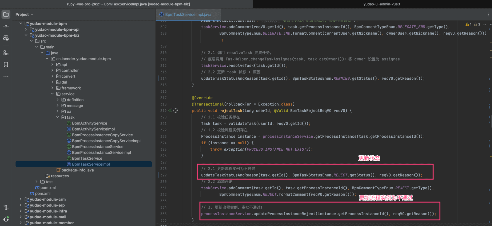 相关视频: 16、[如何实现我的待办任务列表?](http://https://wx.zsxq.com/dweb2/index/topic_detail/184582412518282 "如何实现我的待办任务列表?") 17、[如何实现我的已办任务列表?](http://https://wx.zsxq.com/dweb2/index/topic_detail/812815248812452 "如何实现我的已办任务列表?") 18、[如何实现任务的审批通过?](http://https://wx.zsxq.com/dweb2/index/topic_detail/184582418482282 "如何实现任务的审批通过?") 19、[如何实现任务的审批不通过?](http://https://wx.zsxq.com/dweb2/index/topic_detail/415814518842858 "如何实现任务的审批不通过?") 20、[如何实现流程的审批记录?](http://https://wx.zsxq.com/dweb2/index/topic_detail/585182584812844 "如何实现流程的审批记录?") 本文,我们围绕 [审批中心] 菜单下的 [待办任务]、[已办任务] 两个子菜单,讲解审批通过、审批不通过、驳回的操作流程。 ## 1. 待办任务 待办任务,仅展示需要我审批的任务,对应 [审批中心 -> 待办任务] 菜单,如下图所示:  后端,对应 BpmTaskController 的 #getTaskTodoPage(...) 提供接口 前端,对应 /views/bpm/task/todo/index.vue 实现界面 #1.1 表结构 ① 流程任务表,由 Flowable 提供的 ACT_RU_TASK 表实现,如下所示:  ② 流程参数表,由 Flowable 提供的 ACT_RU_VARIABLE 表实现,如下所示:  ### 1.2 任务状态 任务状态,由 BpmTaskStatusEnum (opens new window)目前有 8 种,如下图所示:  ### 1.3 审批通过 审批通过,由 BpmTaskController 的 #approveTask(...) 提供接口,如下图所示:  最核心的,就是调用 Flowable 的 TaskService#complete(...) 方法,完成任务。同时因为 Flowable 自身没有任务状态,所以需要我们自己维护任务状态。如下图所示:  ### 1.4 审批不通过 审批不通过,由 BpmTaskController 的 #rejectTask(...) 提供接口,如下图所示:  注意,任务只要审批不通过,整个流程都会被中止(审批不通过),即使在或签场景下! ### 1.5 驳回 驳回(退回),将审批重置发送给某节点,重新审批。如下图所示:  ① 获得可驳回的节点,由 BpmTaskController 的 #getTaskListByReturn(...) 提供接口,如下图所示:  ② 发起驳回,由 BpmTaskController 的 #returnTask(...) 提供接口,如下图所示:  核心还是 Flowable 提供的 #moveActivityIdsToSingleActivityId(...) 方法,它是 Activiti 没有内置的方法,所以在 Activiti 实现驳回就略微麻烦一些。 ## 2. 已办任务 已办任务,仅展示我审批过的任务,对应 [审批中心 -> 已办任务] 菜单,如下图所示:  - 后端,对应 BpmTaskController 的 #getTaskDonePage(...) 提供接口 - 前端,对应 /views/bpm/task/done/index.vue 实现界面 ### 2.1 表结构 ① 流程历史任务表,由 Flowable 提供的 ACT_HI_TASKINST 表实现,如下所示:  在 Flowable 中,如果 Task 被完成(审批通过、不通过、取消等)时候,会从 ACT_RU_TASK 表中删除,只能在 ACT_HI_TASKINST 表查询到。这是一种“冷热分离”的设计思想,因为进行的任务访问比较频繁,数据量越小,性能会越好。 ② 流程历史参数表,由 Flowable 提供的 ACT_HI_VARINST 表实现,如下所示:  在 Flowable 中,如果 Task 被完成(审批通过、不通过、取消等)时候,会从 ACT_RU_VARIABLE 表中删除,只能在 ACT_HI_VARINST 表查询到。这当然也是是一种“冷热分离”的设计思想~ ### 3. 流程任务 流程任务,展示系统中所有的任务,一般用于管理员查询,对应 [流程管理 -> 流程任务] 菜单,如下图所示:  - 后端,对应 BpmTaskController 的 #getTaskManagerPage(...) 提供接口 - 前端,对应 /views/bpm/task/manager/index.vue 实现界面 由于它查询的是所有任务,所以读取的是 ACT_HI_TASKINST 表,而不是 ACT_RU_TASK 表。 666. 更多功能 《自动跳过、自动审批》