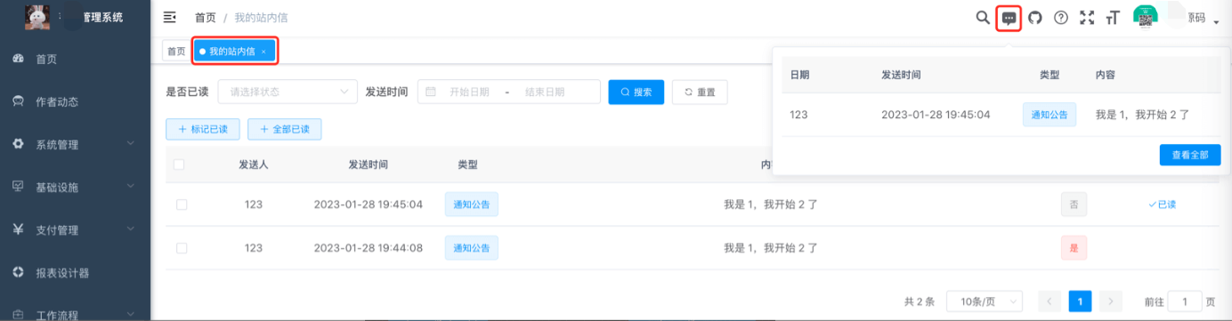 本章节,介绍项目的站内信功能。它在管理后台有三个菜单,分别是: ① 站内信模版:管理站内信的内容模版  ② 站内信管理:查看站内信的发送记录  ③ 我的站内信:查看发送给我的站内信  ## 1. 表结构  ## 2. 站内信配置 本小节,讲解如何配置站内信功能,整个过程如下: 1. 新建一个站内信【模版】,配置站内信的内容模版 2. 测试该站内信模板,查看对应的站内信【记录】,确认是否发送成功 ### 2.1 新建站内信模版 ① 点击 [系统管理 -> 消息中心 -> 站内信管理 -> 模板管理] 菜单,查看站内信模板的列表。如下图所示:  ② 点击 [新增] 按钮,填写信息如下图:  - 模版编号:站内信模板的唯一标识,使用站内信 API 时,通过它标识使用的站内信模板 - 发件人名称:发送站内信显示的发件人名字 - 模板内容:站内信模板的内容,使用 {var} 作为占位符,例如说 {name}、{code} 等 - 模版类型:站内信的分类,可使用 system_notify_template_type 字典进行自定义 - 开启状态:站内信模板被禁用时,该站内信模板将不发送站内信,只打印 logger 日志 > <span style="font-family:楷体">疑问:为什么设计站内信模板的功能? 在一些场景下,产品会希望修改发送站内信的内容、发送人昵称,此时只需要修改站内信模版的对应属性,无需重启应用。 </span> ### 2.2 测试站内信模版 ① 点击 [测试] 按钮,选择接收人为「张三」,进行该站内信模板的模拟发送。如下图所示:  ② 点击 [系统管理 -> 消息中心 -> 站内信管理 -> 消息记录] 菜单,可以查看到刚发送的站内信。如下图所示:  ③ 点击右上角的 [消息] 图标,也可以查看到刚发送的站内信。如下图所示:  ## 3. 站内信发送 ### 3.1 NotifyMessageSendApi 站内信配置完成后,可使用 NotifyMessageSendApi (opens new window)进行站内信的发送,支持多种用户类型。它的方法如下:  ### 3.2 接入示例 以-infra 模块,需要发站内信为例子,讲解 SmsCodeApi 的使用。 ① -infra-biz 模块的 pom.xml引入api 依赖,如所示: > <span style="font-family:楷体"><dependency> <groupId>cn.iocoder.cloud</groupId> <artifactId>yudao-module-system-api</artifactId> <version>${revision}</version> </dependency> </span> ② 在代码中注入 NotifyMessageSendApi Bean,并调用发送站内信的方法。代码如下: > <span style="font-family:楷体">public class TestDemoServiceImpl implements TestDemoService { // 0. 注入 NotifyMessageSendApi Bean @Resource private NotifyMessageSendApi notifySendApi; public void sendDemo() { // 1. 准备参数 Long userId = 1L; // 示例中写死,你可以改成你业务中的 userId 噢 String templateCode = "test_01"; // 站内信模版,记得在【站内信管理】中配置噢 Map<String, Object> templateParams = new HashMap<>(); templateParams.put("key1", "奥特曼"); templateParams.put("key2", "变身"); // 2. 发送站内信 notifySendApi.sendSingleNotifylToAdmin(new NotifySendSingleToUserReqDTO() .setUserId(userId).setTemplateCode(templateCode).setTemplateParams(templateParams)); } } </span>