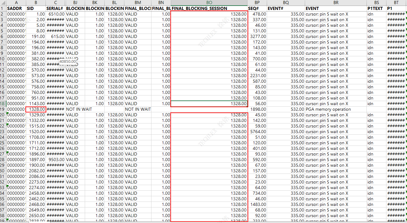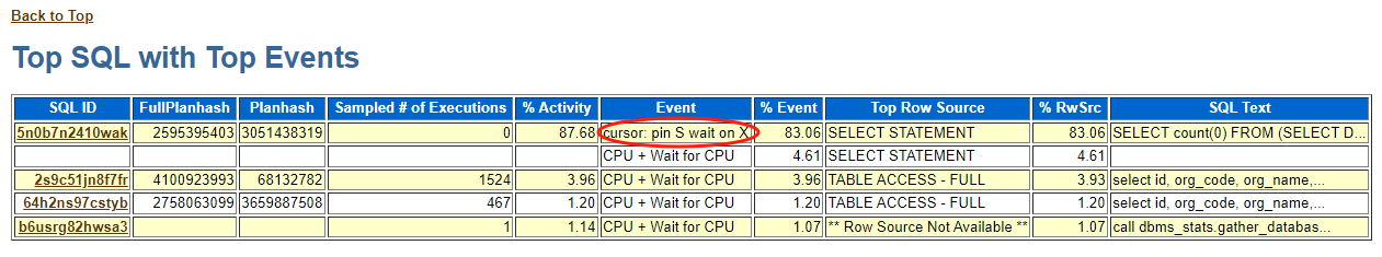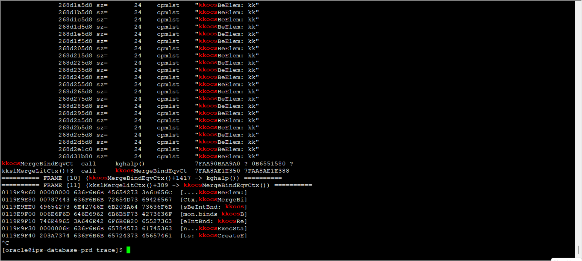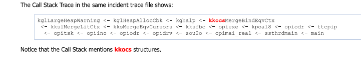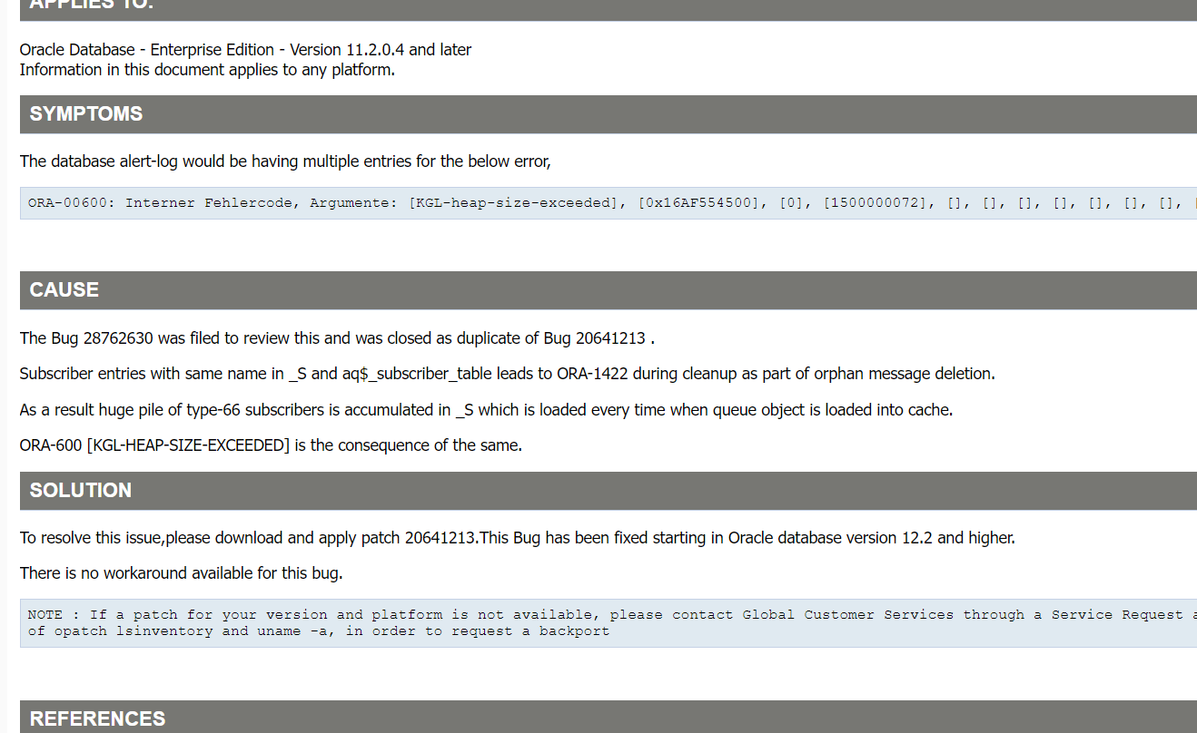 # IPS数据库SQL执行异常:ORA-00600 1. 一、问题描述 1. 1. ASH报告分析 1. sql\_id(5n0b7n2410wak)等待时间cursor: pin S wait on X  * 1. 2. alert.log分析 1. ORA-00600内部错误,引起报错的sql\_id(5n0b7n2410wak)与ASH报告中TOP事件一致 1. 2024-08-27T19:01:38.831711+08:00 2. Memory Notification: Library Cache Object loaded into SGA 3. Heap size 512000K exceeds notification threshold (51200K) 4. Details in trace file /tqls\_system/app/oracle/products/diag/rdbms/ips/ips/trace/ips\_ora\_5711.trc 5. 2024-08-27T19:01:38.831825+08:00 6. KGL object name :SELECT count(0) FROM (SELECT DISTINCT a.ID\_, a.NAME\_, a.CREATE\_TIME\_, a.PROC\_INST\_ID\_, a.BUSINESS\_KEY\_, b.NAME\_ AS instanceName, b.KEY\_, a.TASK\_DEF\_KEY\_, aha.VAR\_JSON\_ FROM ACT\_RU\_TASK a JOIN ACT\_RE\_PROCDEF b ON a.PROC\_DEF\_ID\_ = b.ID\_ LEFT JOIN ACT\_RU\_IDENTITYLINK c ON a.ID\_ = c.TASK\_ID\_ JOIN ACT\_RE\_DEPLOYMENT d ON b.DEPLOYMENT\_ID\_ = d.ID\_ LEFT JOIN ACT\_HI\_ACTINFO aha ON a.PROC\_INST\_ID\_ = aha.ID\_ WHERE (c.USER\_ID\_ = :1 OR a.assignee\_ = :2 ) AND b.CATEGORY\_ = :3 ) table\_count 7. Errors in file /tqls\_system/app/oracle/products/diag/rdbms/ips/ips/trace/ips\_ora\_5711.trc (incident=1014067): 8. ORA-00600: internal error code, arguments: [KGL-heap-size-exceeded], [0x0EECD5ED8], [0], [524288016], [], [], [], [], [], [], [], [] 9. Incident details in: /tqls\_system/app/oracle/products/diag/rdbms/ips/ips/incident/incdir\_1014067/ips\_ora\_5711\_i1014067.trc 10. Use ADRCI or Support Workbench to package the incident. 11. See Note 411.1 at My Oracle Support for error and packaging details. 1. 二、问题处理 1. 1. v$session视图分析  * + 1. 正在执行sql\_id=5n0b7n2410wak的会话有83个 2. sid=1328的会话等待事件:PGA memory operation 3. 其他82个会话都在等待sid=1328 4. sql\_id=5n0b7n2410wak查询语句,仅持有S锁,不持有X锁,逻辑上不会阻塞其他会话的执行 5. 锁定原因:是sql\_id=5n0b7n2410wak触发了ORACLE内部BUG,导致执行计划异常 6. 特别说明:在异常期间,PLSQL直连数据库执行sql\_id=5n0b7n2410wak,成功 1. 2. 阻塞会话清理 1. kill会话1328,执行失败 1. ALTER SYSTEM KILL SESSION '1328,18547'; 2. OS kill process:成功 1. sql> select spid from v$process where addr = paddr; 2. ps -ef |grep spid 3. kill -9 spid 3. 发现阻塞变成了sql\_id(5n0b7n2410wak)的另一个会话 4. 杀掉执行sql\_id(5n0b7n2410wak)的所有会话的process 5. 很快又有新的sql\_id(5n0b7n2410wak)会话进来,继续阻塞后面的会话 2. 3. 关闭应用,kill all os-process from sql\_id(5n0b7n2410wak),然后重启数据库:sql执行恢复正常 3. 4. ORA-00600分析  * + 1. 1)该错误是oracle12.2以下版本的bug:但我们的数据库版本是12.2版本,理论上不存在该bug 2. 2)doc id 2628072.1:ora-00600文档分析 1. bug确认:文档中提及的kkocs在trace file中有找到   * + 1. 3)doc id 2628072.1:给到的解决方案 1. 1.升级数据库到19.1:代价较大,相应的应用需要做较大调整,不推荐 2. 2.升级补丁patch 20917487:可行 3. 3.关闭adaptive cursor sharing功能:可能会影响所有SQL的执行计划,有风险,不推荐 2. 4)因不清楚该BUG触发的机制:修改该sql或者绑定执行计划并无目标方向,但通过改写sql或绑定执行计划是能减少触发bug风险:可行 1. 三、总结 1. 1. 确认问题:在一系列前提的基础上sql\_id(5n0b7n2410wak)执行触发了oracle内部bug:ora-00600,一般情况下sql\_id(5n0b7n2410wak)执行并不会触发该bug; 2. 2. 测试环境复现触发bug前的工作流,看能不能再次出发该ORACLE内部bug:ora-00600 3. 3. 后续措施 1. 1)补丁升级:patch 20917487 2. 2)修改sql,减少触发bug的风险 4. 4.ips系统优化建议 1. IPS系统将大量的数据计算处理放到数据库层:不符合当前软件设计的主流思想。 2. 建议:逐步将数据计算处理转移到应用层。
