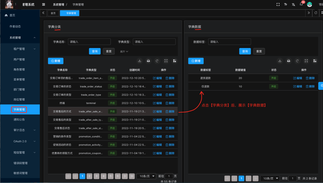 本小节,讲解前端如何使用 [系统管理 -> 字典管理] 菜单的字典数据,例如说字典数据的下拉框、单选 / 多选按钮、高亮展示等等。  ## 1. 全局缓存 用户登录成功后,前端会从后端获取到全量的字典数据,缓存在 store 中。如下图所示:  这样,前端在使用到字典数据时,无需重复请求后端,提升用户体验。 不过,缓存暂时未提供刷新,所以在字典数据发生变化时,需要用户刷新浏览器,进行重新加载。 ## 2. DICT_TYPE 在 dict.ts 件中,使用 DICT_TYPE 枚举了字典的 KEY。如下图所示:  后续如果有新的字典 KEY,需要你自己进行添加。 ## 3. DictTag 字典标签 <span style="font-family:楷体"><span style</span>="font-family:楷体"><dict-tag /> </span>(opens new window)组件,翻译字段对应的字典展示文本,并根据 colorType、cssClass 进行高亮。使用示例如下: <!-- type: 字典 KEY value: 字典值 --> <span style="font-family:楷体"><dict-tag</span> :type="DICT_TYPE.SYSTEM_LOGIN_TYPE" :value="row.logType" />  【推荐】注意,一般情况下使用 CRUD schemas 方式,不需要直接使用 <dict-tag />,而是通过 columns 的 dictType 和 dictClass 属性即可。如下图所示:  ## 4. 字典工具类 在 dict.ts 文件中,提供了字典工具类,方法如下: > <span style="font-family:楷体">// 获取 dictType 对应的数据字典数组【object】 export const getDictOptions = (dictType: string) => {{ /** 省略代码 */ } // 获取 dictType 对应的数据字典数组【int】 export const getIntDictOptions = (dictType: string) => { /** 省略代码 */ } // 获取 dictType 对应的数据字典数组【string】 export const getStrDictOptions = (dictType: string) => { /** 省略代码 */ } // 获取 dictType 对应的数据字典数组【boolean】 export const getBoolDictOptions = (dictType: string) => { /** 省略代码 */ } // 获取 dictType 对应的数据字典数组【object】 export const getDictObj = (dictType: string, value: any) => { /** 省略代码 */ } </span> 结合 Element Plus 的表单组件,使用示例如下: > <span style="font-family:楷体"><template> <!-- radio 单选框 --> <el-radio v-for="dict in getIntDictOptions(DICT_TYPE.COMMON_STATUS)" :key="dict.value" :label="parseInt(dict.value)" > {{dict.label}} </el-radio> <!-- select 下拉框 --> <el-select v-model="form.code" placeholder="请选择渠道编码" clearable> <el-option v-for="dict in getStrDictOptions(DICT_TYPE.SYSTEM_SMS_CHANNEL_CODE)" :key="dict.value" :label="dict.label" :value="dict.value" /> </el-select> </template> <script setup lang="tsx"> import { DICT_TYPE, getIntDictOptions, getStrDictOptions } from '@/utils/dict' </script> </span>