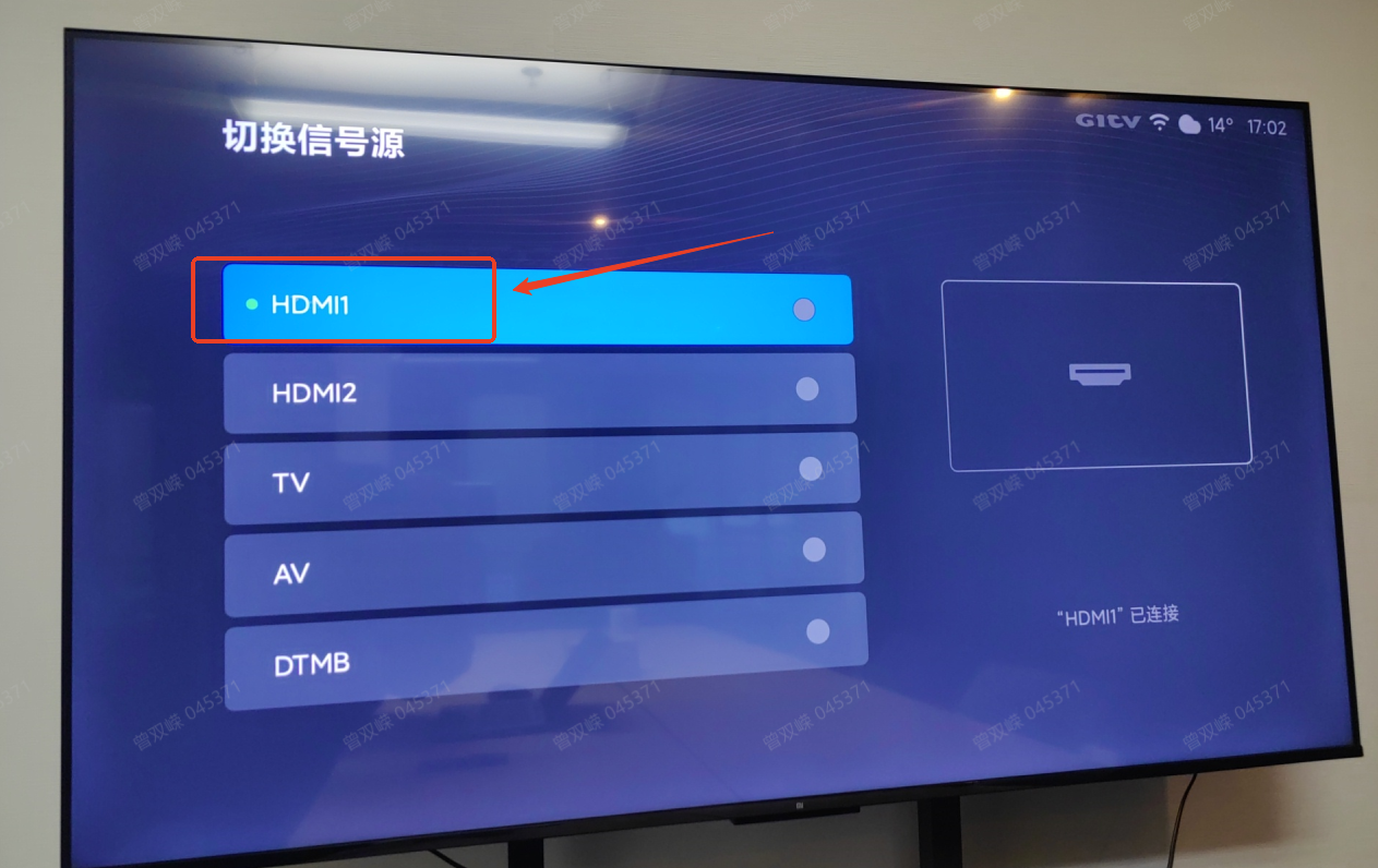 ## 会议室操作手册 1. 开启插座电源,检查钉钉盒子是否通电,以及网线是否接入  2. 电视机使用遥控器打开,如果显示为电视画面,不是钉钉投屏画面  3. 使用遥控器按菜单键  4. 电视机选择信号源设置,点击确认  5. 选择HDMI1确认  6. 此时画面切换为钉钉投屏界面,可正常使用